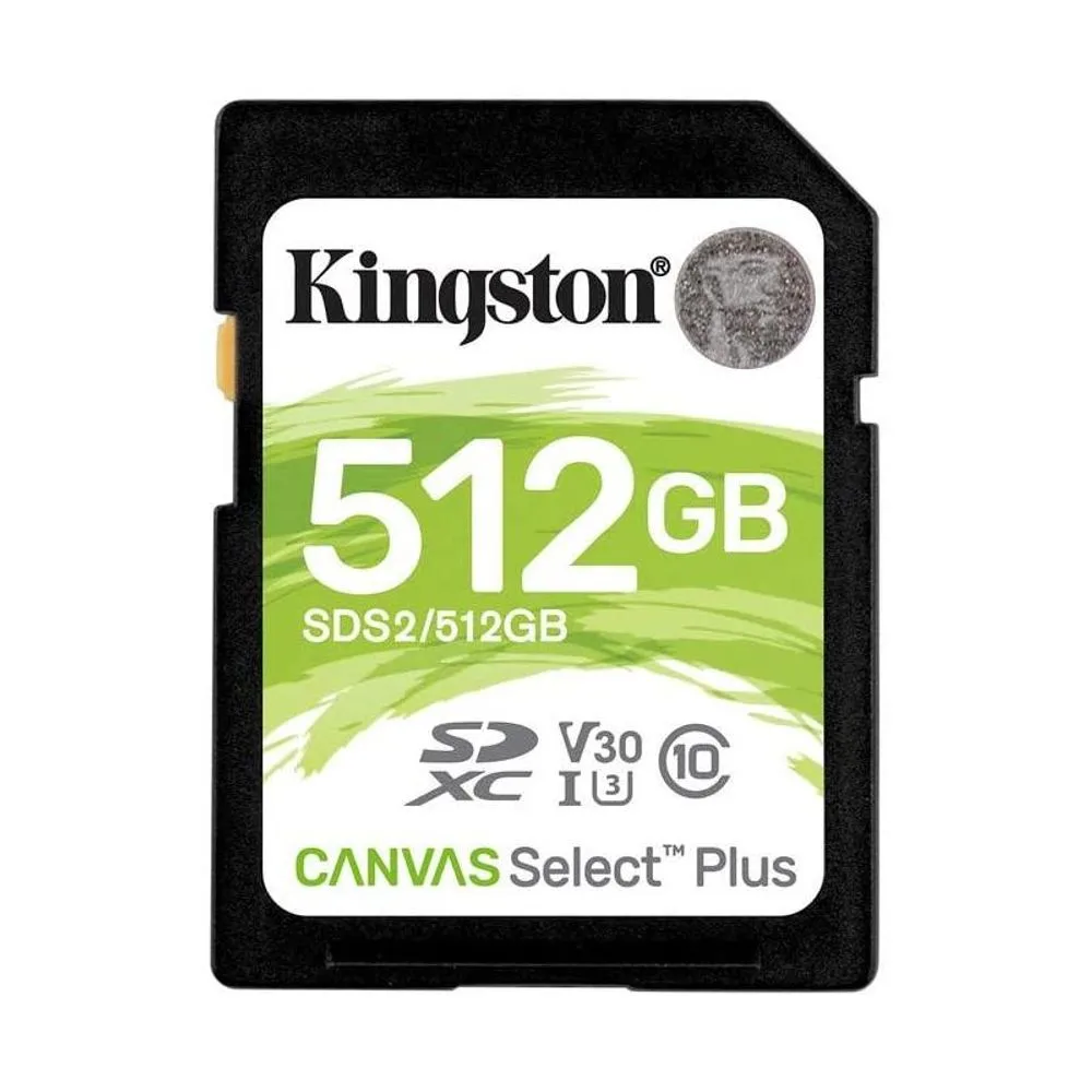 Kingston Technology Canvas Select Plus. Capacidade: 512 GB, Tipo de flash card: SDXC, Classe de memória flash: Classe 10, Tipo de memória interna: UHS-I, Velocidade de leitura: 100 MB/s, Velocidade de escrita: 85 MB/s, Classe de velocidade UHS: Class 3 (U3), Classe de velocidade de vídeo: V30. Funcionalidades de proteção: Resistente ao choque, À prova de vibração, À prova de raio-x, Cor do produto: Preto